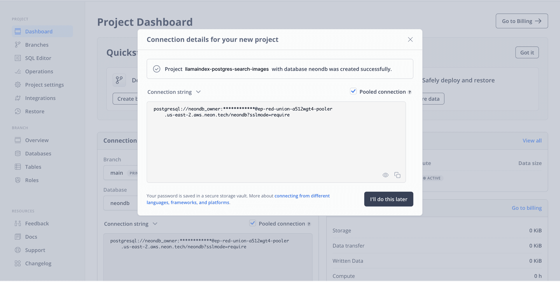 You will then be presented with a dialog that provides a connecting string of your database. You can enable the Connection pooling toggle for a pooled connection string.